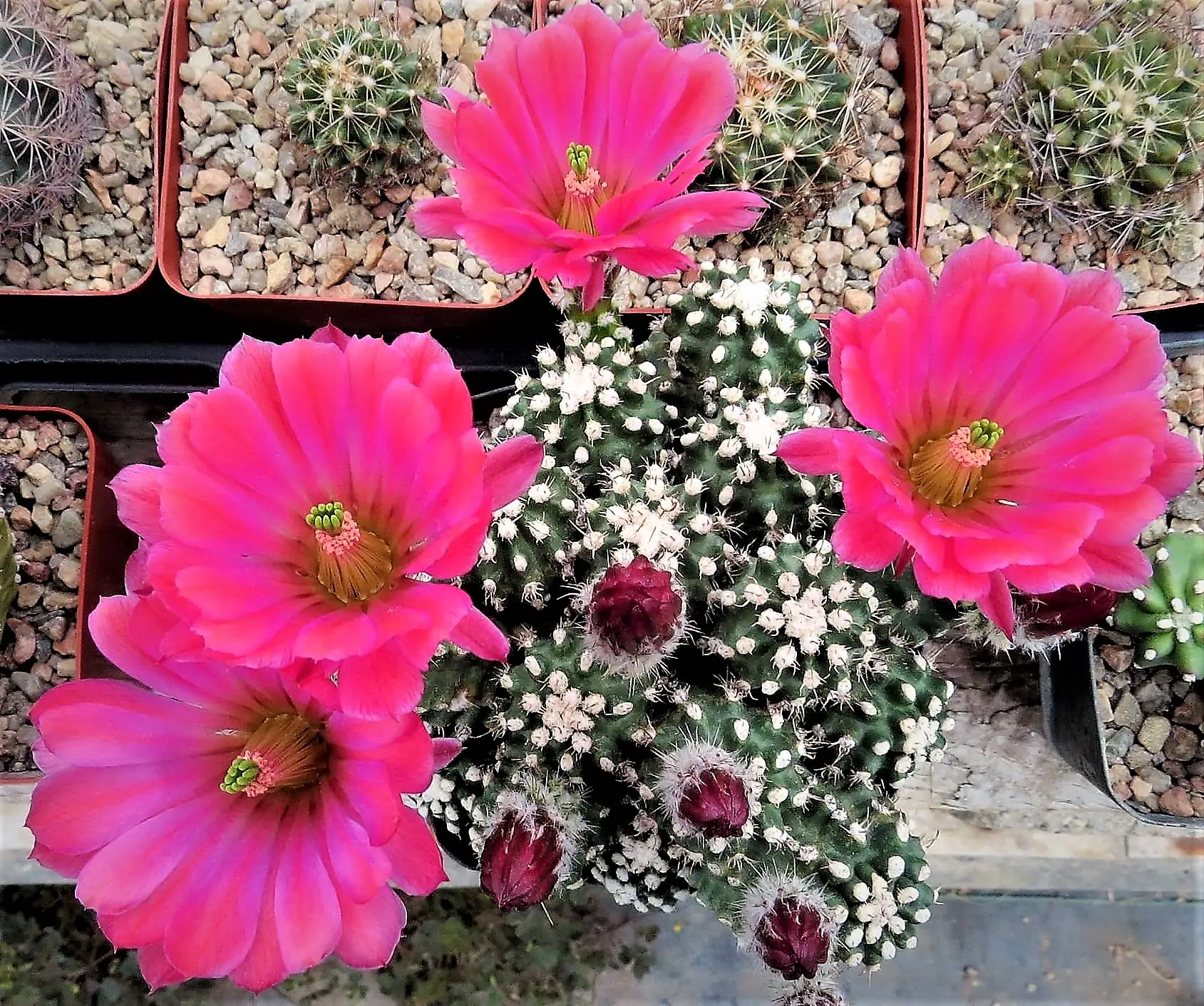 Echinocereus mojavensis f. inermis Yard Hybrid "Giant Pink" Flowers start out redder, then fade to the unique color you see in the picture, as they age. (01/13)
