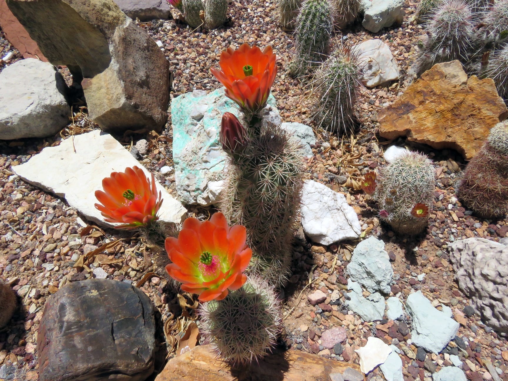The plant with the large orange flowers is Echinocereus x lloydii. The small plant with copper flowers is E. chloranthus. (01/15)