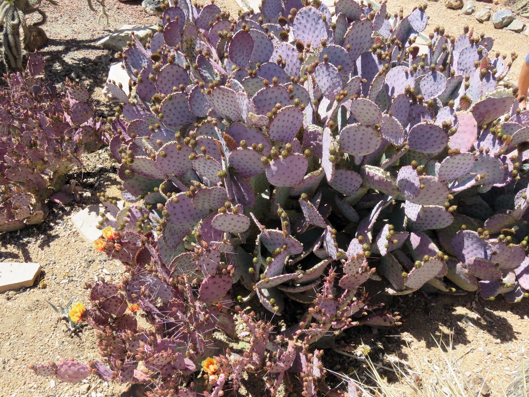 Opuntia santa-rita and macrocentra. During the winter and spring before the summer rains come, the plants are mostly bluish purple. In mid summer when the rains come, they turn more green. (07/15)