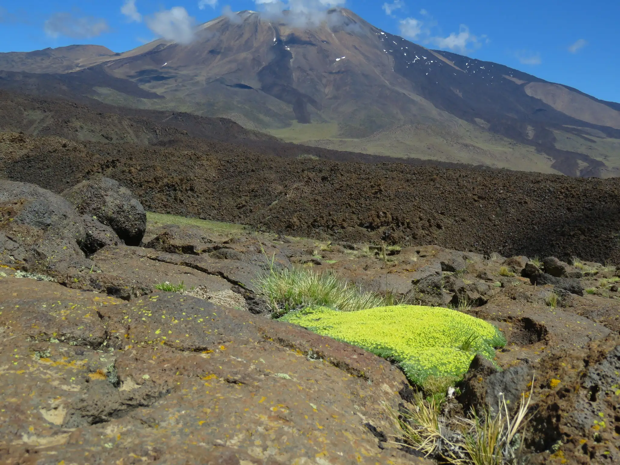 Everywhere you go there are volcanoes in view, this is Volcan Tromen at 15,427 ft high, with a lot of recent lava that has flowed out. You can see streaks of the lava on the sides of the volcano. In the foreground is the amazing Azorella monantha with leaves like steel. (7/7)