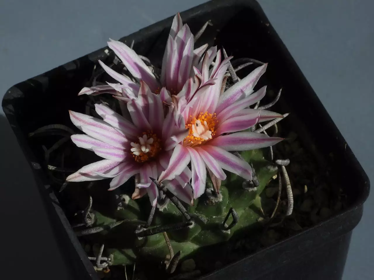 My faithful Turbinicarpus. I've been nurturing this plant and its mate for more than 15 years. I have never, so far, made any seeds of the species. Actually, I've never made a single seed of any Turbinicarpus species. Oh, well. The pot is 2.5" (6 cm) on a side. The heavy duty-looking spines are actually soft. You can't get stuck by these spines. (01/40)