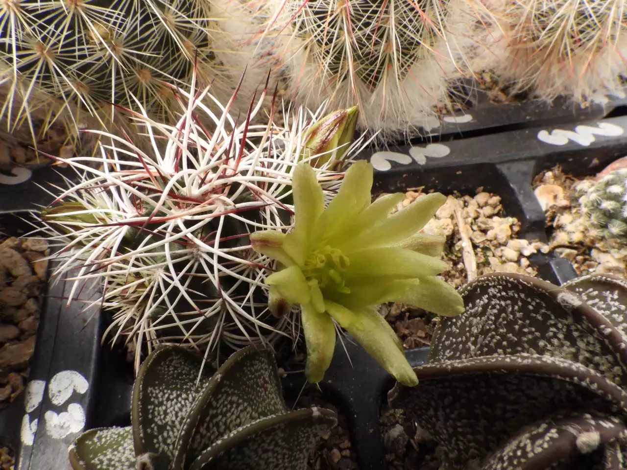 All books that I have read list this plant as Echinocereus viridiflorus davisii. This is just nonsense. There is some nutcake in the taxonomic world who thinks all greenish flowered small Echinocereus must be some flavor of viridiflorus. This picture makes my case. Yes, there is a small yellow green flower, but the spines are a world away from E. viridiflorus. Maybe a dozen worlds. Or a hundred. In fact these spines are so unique that maybe someone ought to erect a new genus for this plant. There is nothing like it in the spine morphology of Echinocereus that I'm aware of. (05/40)