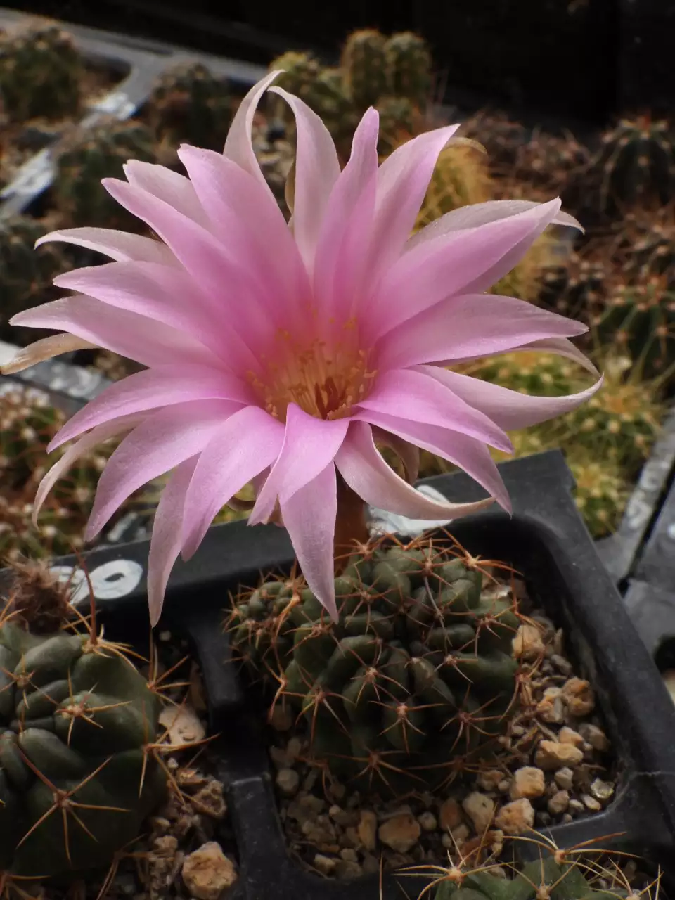 This is an interesting species. The plant is in a cell about 1" on a side. The flower is HUGE compared to the plant. I have three mature plants which were a gift of Kathy McCoy. They had flowers about the size of that you see here. But the plants ranged from baseball to softball sized. One of the failings of the cactus god is that the flowers don't seem to get much bigger as the plant gets bigger. (07/40)