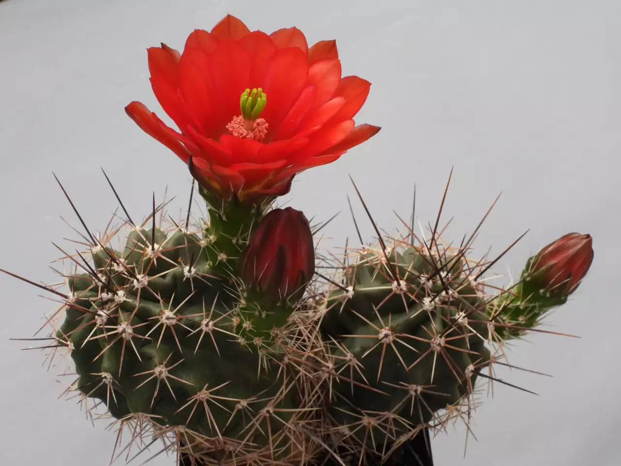 Echinocereus bonkerae X Echinocereus triglochidiatus    4/11/22 This hybrid might be cold hardy, given the E. trig parentage. I like the intense orange red. The pot that you barely see is 2.5" (6 cm) on a side. (12/40)