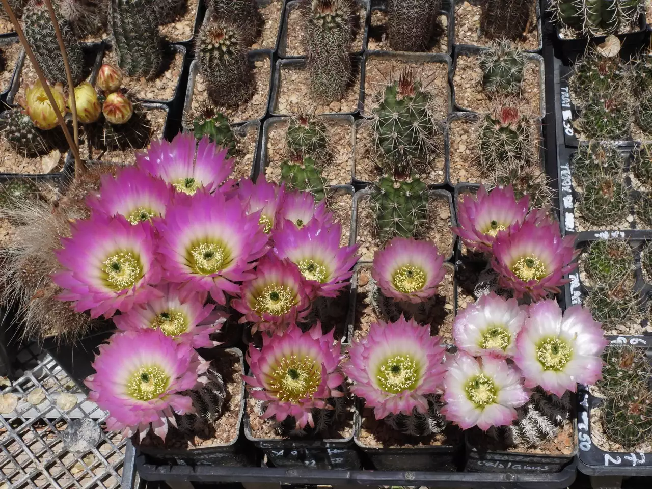 This is one of my several attempts at saving a particular population. That is, Mesa Garden has lost its seed source. I so like the spines that I would like the population not to be lost. Note the three flowers of the bottom right plant. (04/56)