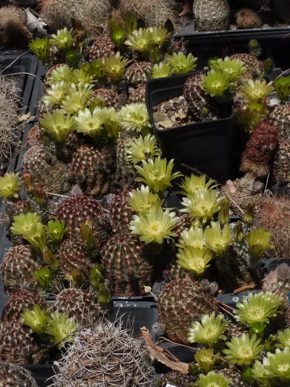 I have over a thousand plants of this species of various ages. The plant is really nice for doing breeding because this species can easily flower after less than a year from sowing. The plants you see are all in cells 1 inch (2.5 cm) square and about 1 inch deep. They've been in these tiny quarters for more than 7 years. (10/56)