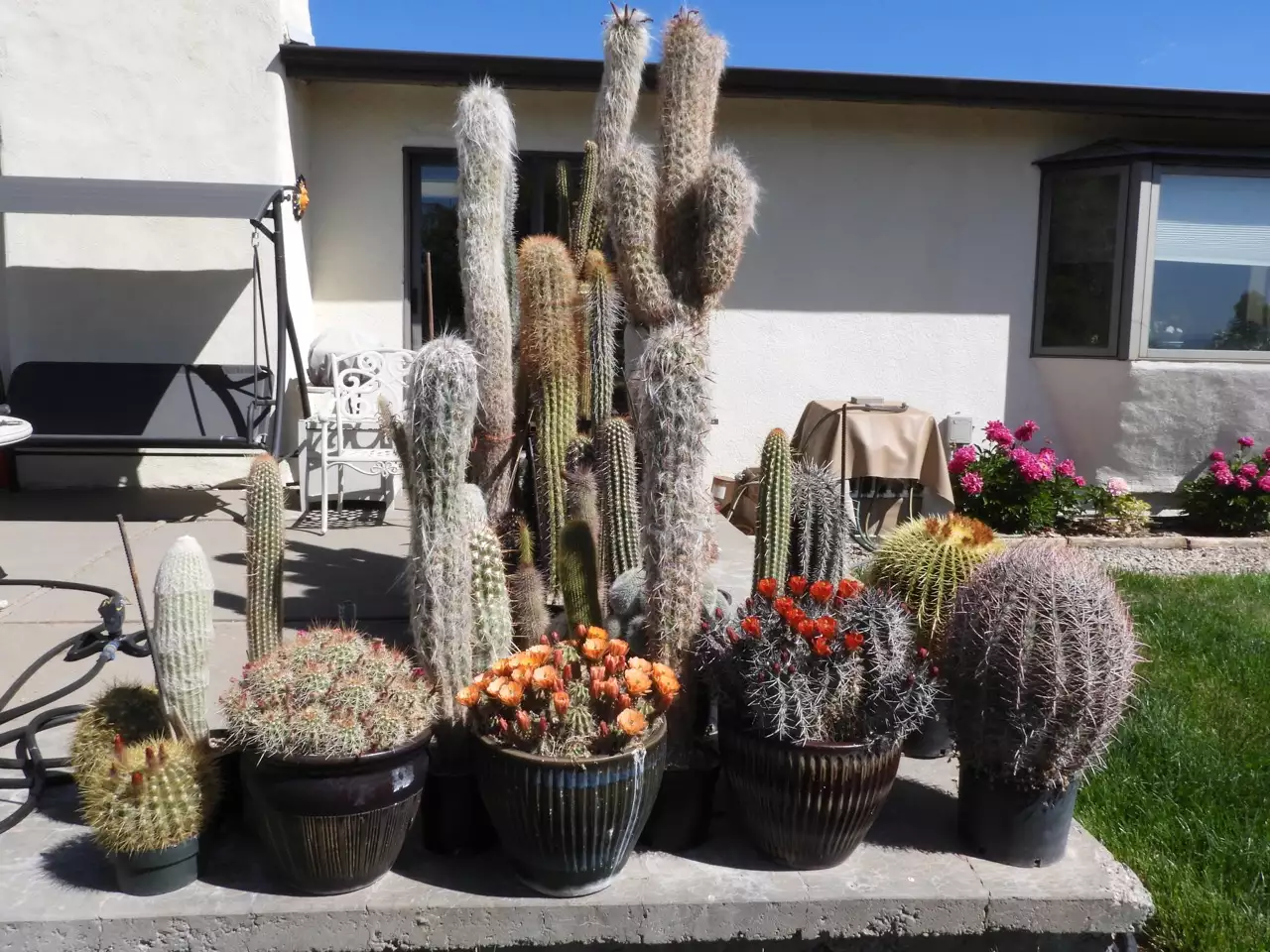 This is the view of my patio cacti. I like growing a few plants in big pots. They can really expand themselves into an impressive display. The reddish flowered plant in the previous picture is the far right plant next to the Ferocactus cylindraceus, which is the last plant on the right. ("cylindraceus" was "acanthodes" for the longest time) (34/56)