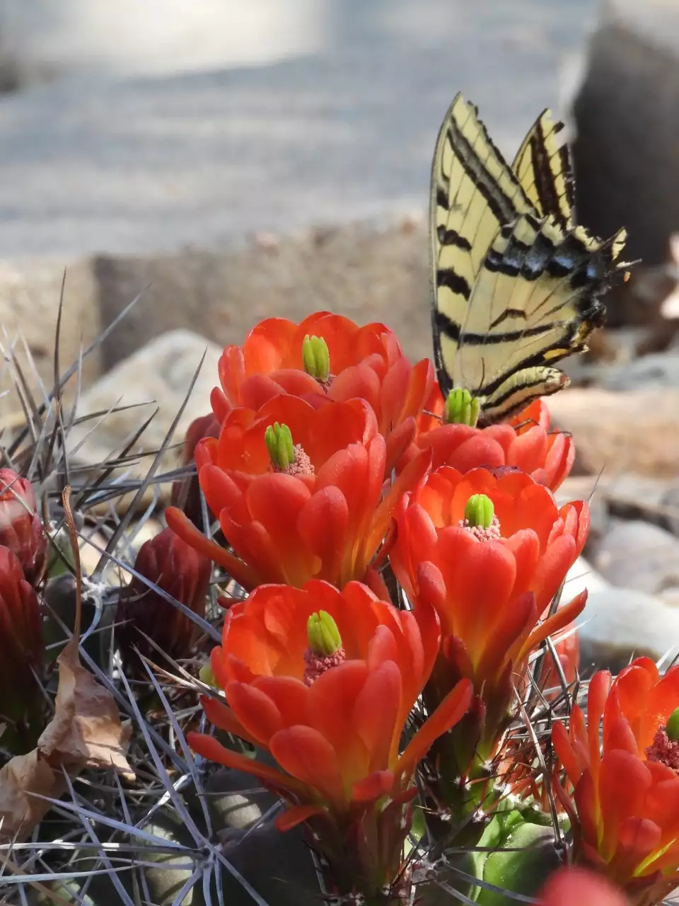 You didn't notice this in the previous picture, but the scene is there. The swallow-tail butterfly is desperate for food and drink. In all my years of cactus growing, I have never seen a butterfly trying to get a hit of nectar. (37/56)