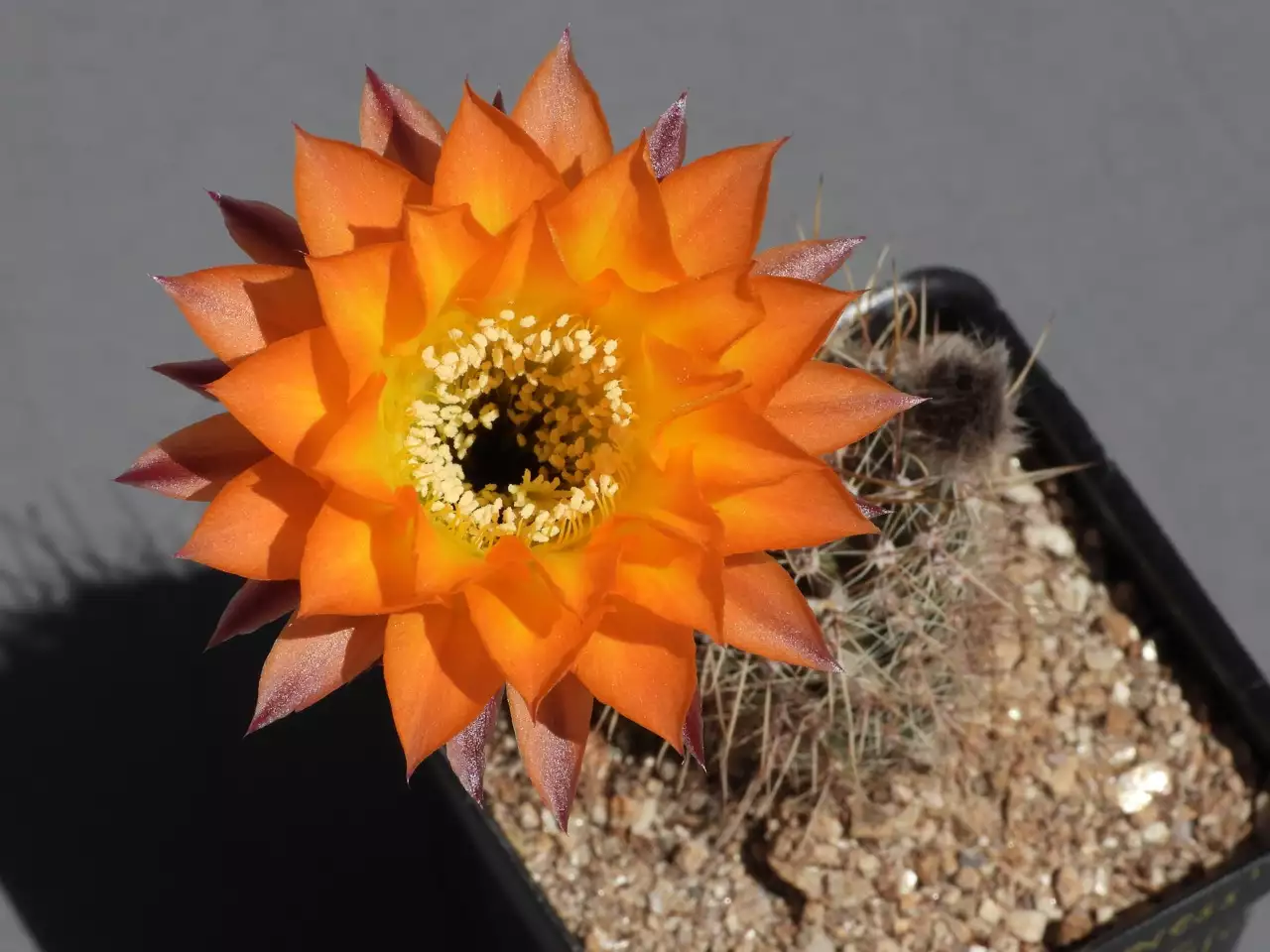 My friend, Ralph Peters, gave me some years ago a yellow flowered Trichocereus hybrid he had made. I crossed it into the "Sorceress" plant you saw above. The resulting plants, now a bit bigger than a golf ball, are flowering, in many different colors. The pot is 2.5" (6 cm) on a side. (47/56)