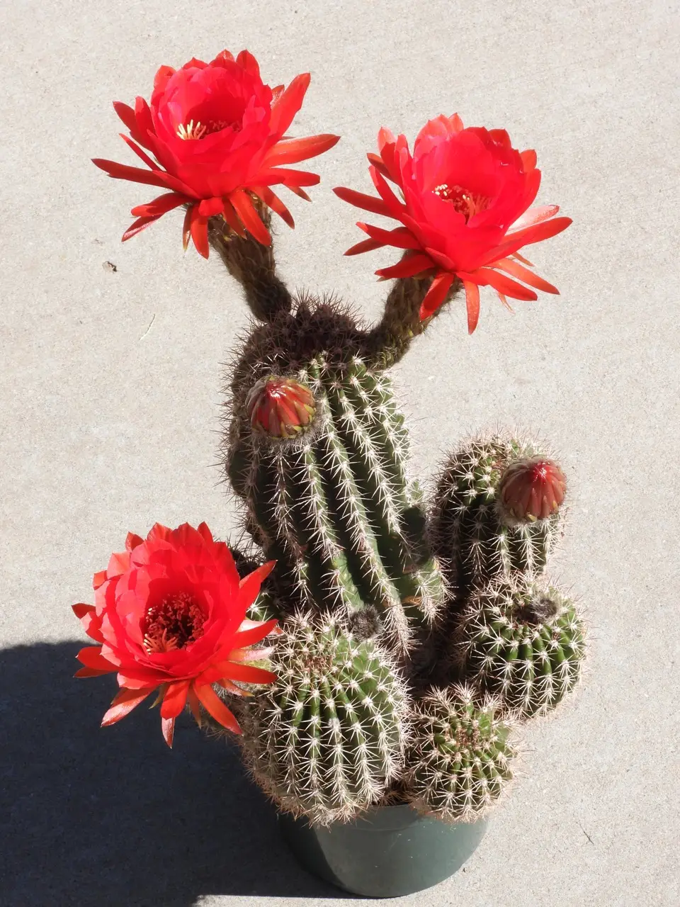 Mesa Garden in Belen NM is an excellent source of Trichocereus seeds, including this wonderful hybrid that comes in many different colors. I'm pretty sure that the five flowers are due to good watering and fertilization last growing season, that is, the previous year. The pot is 5" (12.5 cm) in diameter. (03/48)