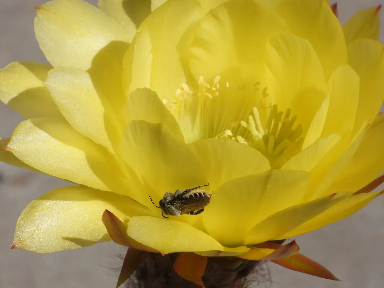Bee in Trichocereus lobivioides grandiflora flower     6/4/22 This bee species often lies in a catatonic state in cactus flowers. (07/48)