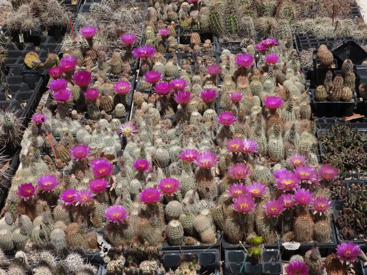 All the plants in flower are the same species, in spite of their different stem coloration. This difference gets much more pronounced in bigger plants. These plants are in tiny pots - root balls a little bigger than one cubic inch (16 cc). This prevents the plants from reaching their proper mature appearance. Planting them in much bigger pots or in the ground would allow them to age properly. The species, by the way, is cold hardy enough that it can be grown outside almost anywhere in the US. Flower colors are typically shades of magenta, but some populations have very pale pinkish flowers, and I found a reddish sport among my herd last tear. (10/48)