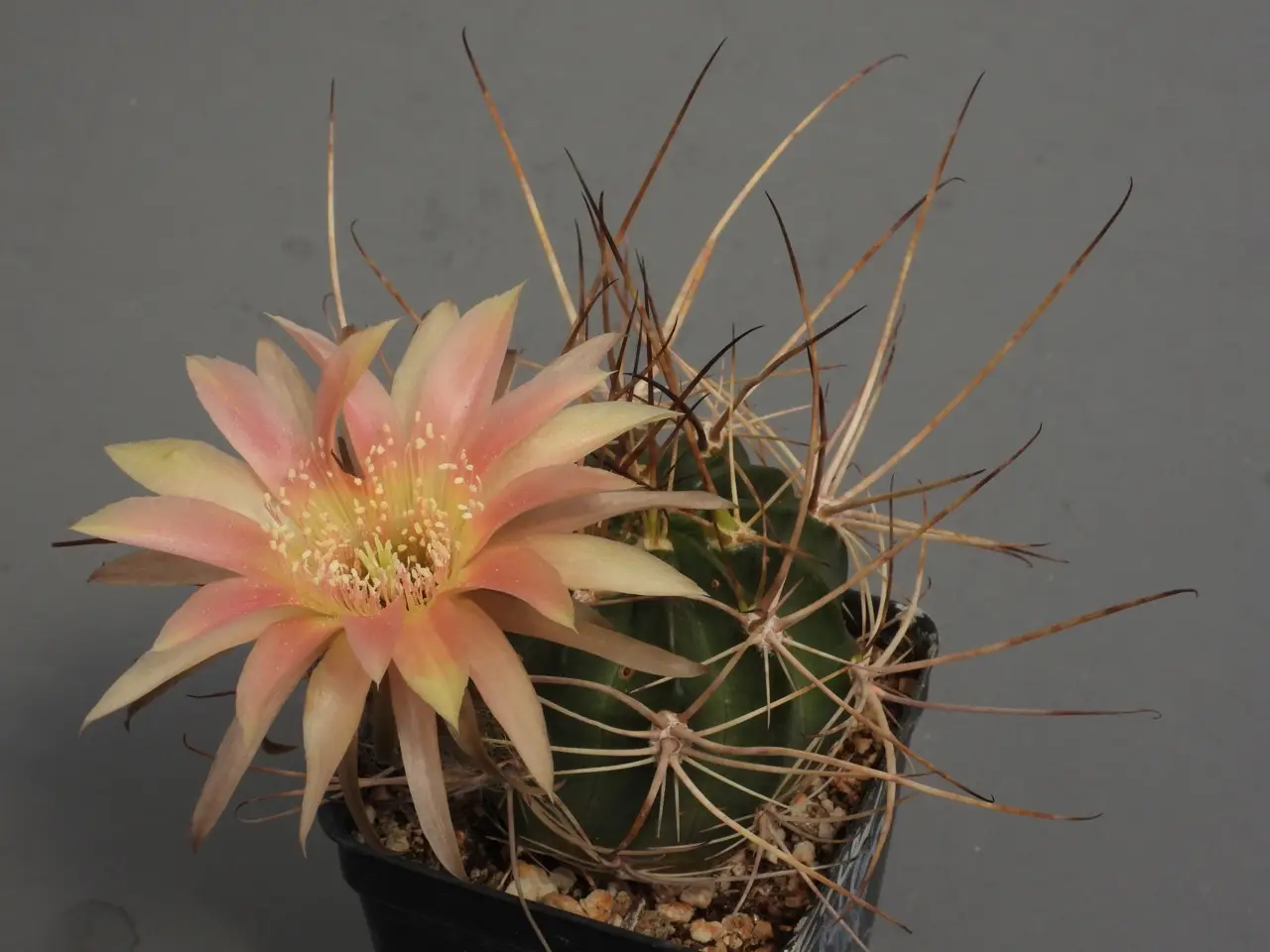 I crossed a two-tone plant with a white plant and this two-tone seedling was produced. This is the only one of the bunch of seedlings that bloomed this summer. Maybe the others will flower next summer. I'm happy that the two-tone thing was captured in my crossing. At least it happened once. The pot is 2.5" (6 cm). I think that this species is a real marvel. It blooms when very small, and never stops as it grows to a soccer ball (football in the not-American world) size, or more in maybe five more years, Lots more flowers are produced in the process. (17/48)