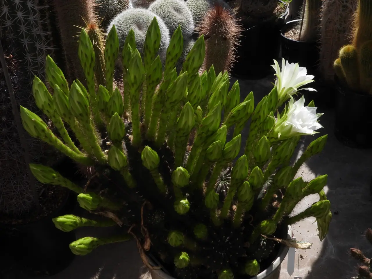 Two new flowers (they open at night, stay open to noon, and are crumpled by late afternoon.) The other buds are threatening a massive bloom. There was rain in the forecast so I put the plant into the greenhouse. (28/48)