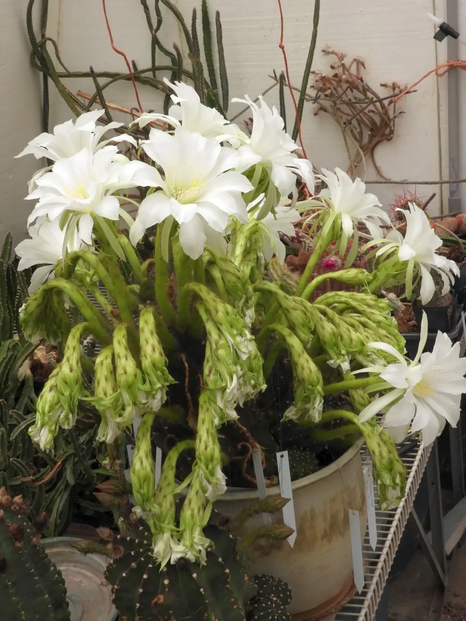 Next morning, the other turgid buds that can be seen in the previous picture opened overnight. The previous day's flowers continue their crumbling. The white tags are my hybridization notes. This plant continued giving me small flushes of several flowers until a couple of days ago, August 28, 2022. (32/48)
