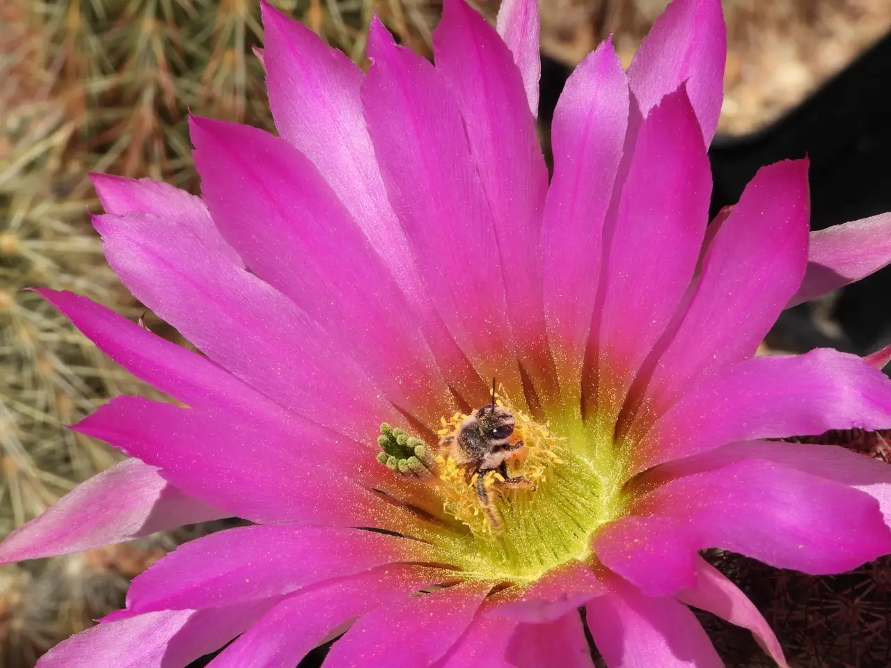 Bee in Echinocereus bristolii pseudopectinatus L609 MG184     6/15/22 This bee is a little smaller than a European honeybee. (38/48)