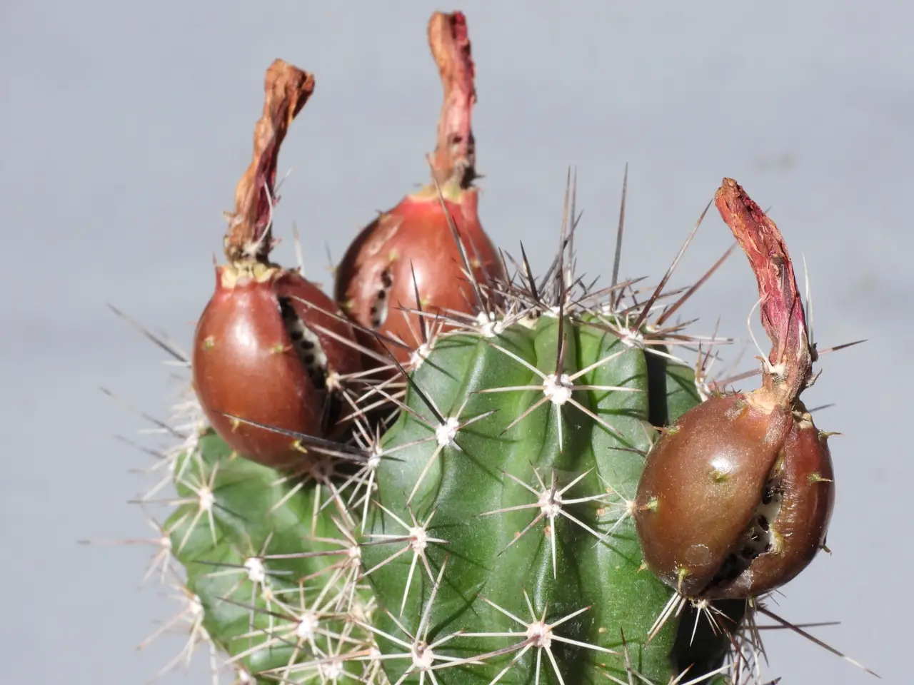 I decided to show you what a ripe Echinocereus fruit looks like. You're looking at ripe ovaries, each having maybe 200 seeds or more. The cracking of the fruit is analogous to what happens when you blow up a balloon. Eventually, the balloon bursts. Same thing here, but the fluid that's pumped into the fruit when the seeds are ripe is water. The fruit are split by hydrostatic pressure. There is a technical term for the splitting of these fruit - "longitudinally dehiscent". Imagine the fruit as the earth. The spent flower carcass is at the North Pole. The split in the fruit is parallel to some meridian of longitude. Hence, "longitudinally dehiscent." The "dehiscent" refers to the splitting. There are other patterns (latitudinally, basally, etc.) and the pattern is part of a correct description of the plant which you might find in a botanical key. The fruit were covered in spines a few days ago. They fell off over several days. (They can be brushed off easily if the fruit is ripe.) These spines are called "deciduous" in a proper description of the plant. I prefer to collect seeds from fruit that have split, but sometimes I have to take what's available. Often there are viable seeds in a fruit that doesn't look ripe. Viable seed are typically black, or maybe brown, in color. Note the white matrix that can be seen in the cracks, along with the black seeds. This matrix is actually what happens to the umbilical cords that connected to the seeds starting at conception and continuing to ripeness (40/48)