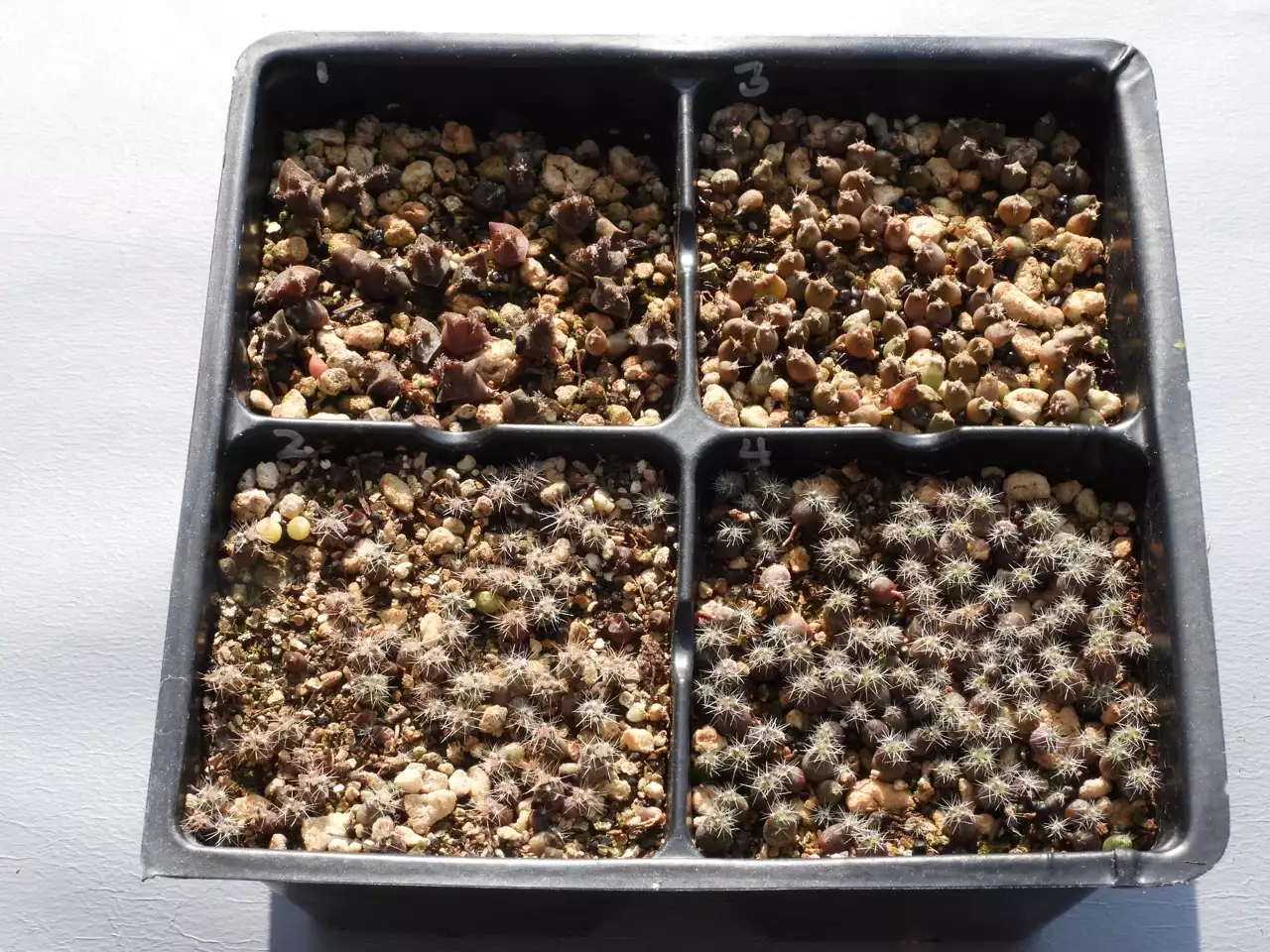 Two weeks later. Note that Echinocereus triglochidiatus seems to have a long germination period. That is, there were 49 plants after about a week to ten days, but there are 101 on September 19, about 33 days later. It happens that I've never grown Echinocereus triglochidiatus and Escobaria missouriensis next to each other before this exercise. I was so surprised at how much alike the two species looked that I thought I had gotten the wrong seeds for one of these cells. But they check out to be as labeled. It actually is not too much of a surprise that baby cacti look alike. As I said before, there is no reason for heavy competition in the seedling phase of their growth. A better reason, or an additional reason, is that the whole notion of taxonomy is that you can trace a group of different species back to a common ancestor. You've got evidence for this notion in this exercise. You will have noticed that even in these last two weeks, much spine growth has happened to the two species under discussion. Just like ordinary plants which have leaves that start appearing shortly after germination, cacti also have their leaves - modified as spines - that grow very soon after germination. Incidentally, spines are not "thorns." Technically, thorns are modified shoots.