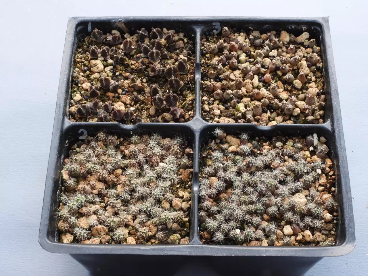 Two weeks later. The plants are really small. They're only eight weeks old. They've got spines. They are identifiably cacti. Note again how similar the Echinocereus triglochidiatus and the Escobaria missouriensis appear. Note also how uniformly large (uniformly small?) the members of each of the four species are. Look especially at the Peniocereus greggii seedlings. The eventual size variation of all four species hasn't yet kicked in. Size at any point is a function of both genes and environment. Environment is typically food and water, but, for plants, it turns out root room is also extremely important. This principle is shown by all the bonsai plants in small pots. (I saw tens of thousands of bonsai all over China in my four trips there, including a supposedly thousand year old banyan tree about 8' tall in a 6'X6'ceramic pot. A banyan tree growing wild will be more than 50' tall and cover many acres(!), since the branches sent out roots and thereby grow to cover a lot of ground.) The key factor making those plants small is the pot size. There is no special skill required to make a bonsai plant. Small pots are all it takes. If you look for them, you can find lots of very old and very small cactus plants surviving in nature in some crack in a rock. The crack and rock are the bonsai pot.