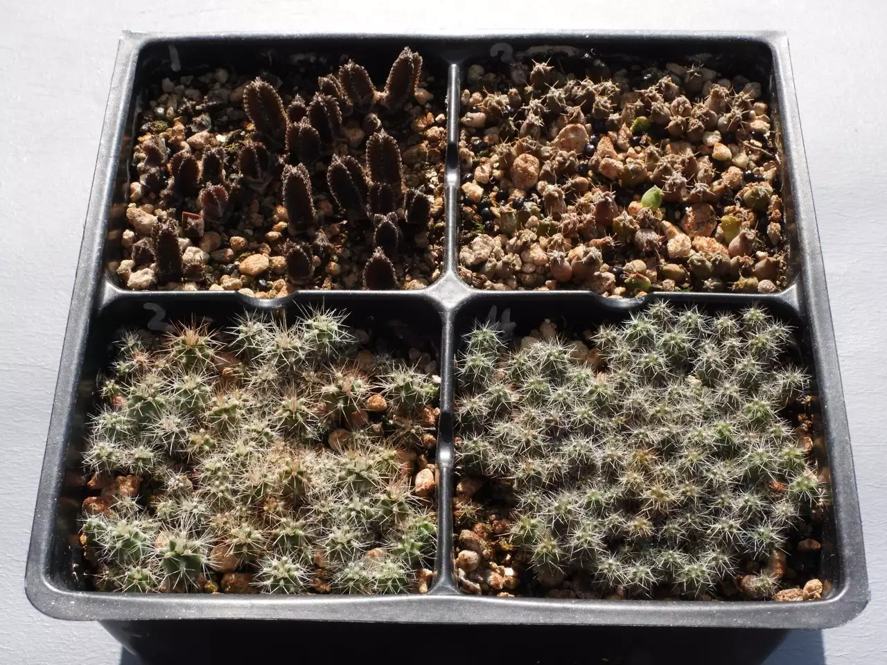 Two weeks later. Here are some really odd numbers. I obviously stopped counting germinations some days before I had done so for the previous 4 sets. Sorry. I can't remember what happened and I didn't write any explanation. I hadn't noticed this until I organized this article. I really hadn't thought this entire thing through before I started. I decided to just wing it and see what I learned for a better run for next year's Labor Day show. The overall germination of the P. greggii (the Sept 19 number) is suddenly getting really good. The A. capricorne look much better than their older brethren; they're fatter-looking. The Escobaria missouriensis population has more members. Recall that the maximum expected germination is the original 150 seeds counted out for each seeding in the 4th cell of each of the 8 sets. (The white numbers 1, 2, 3, 4 are discernible on the left hand of the farthest cell walls.) The Echinocereus triglochidiatus are getting fatter than the Escobaria missouriensis, even though the two still look very much alike. The size differentiation of the P. greggii seedlings in Cell #1 is getting pronounced.