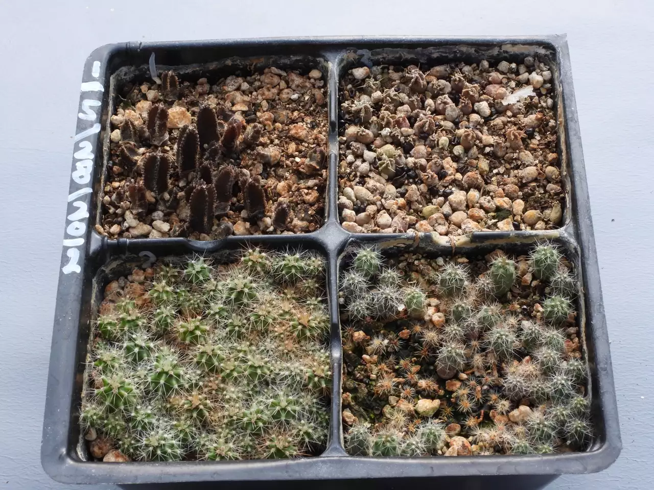 Two weeks later. Apparently I had bad luck in Set 8 (next page) with germination of P. greggii. Set 7 has twice the germination as Set 8. This is not unusual. I and every seed grower have seen the same seed source giving close to 100% germination in one pot and very little, even ZERO!! germination in another pot. The two pots may be right next to each other when all this happens. No explanation has ever been found. More germination has happened in the E. triglochidiatus cell since counting was stopped a week or so after sowing. The A. capricorne have lost a few members. This is an important point. When you do stuff like this with a large enough sample of any living system, stuff dies. If nothing dies, it's a miracle. Miracles don't happen. (I had a summer job once taking data of a very expensive experiment on cloning Douglas fir trees. We measured the tree growth as a function of some variables. A colleague technician was extremely good at taking care of his trees. They were doing splendidly. Then his boss noticed. None of the trees died. Everybody else had a few dead trees. It turns out that the colleague, rather than measure trees, was spending his time not in the field, but getting drunk somewhere and making up the data.) Death is very evident in the Escobaria missouriensis cell. Note the little starry things with brown centers scattered across the cell. Death by fungus, probably. Lost 66% of the original population, so far.