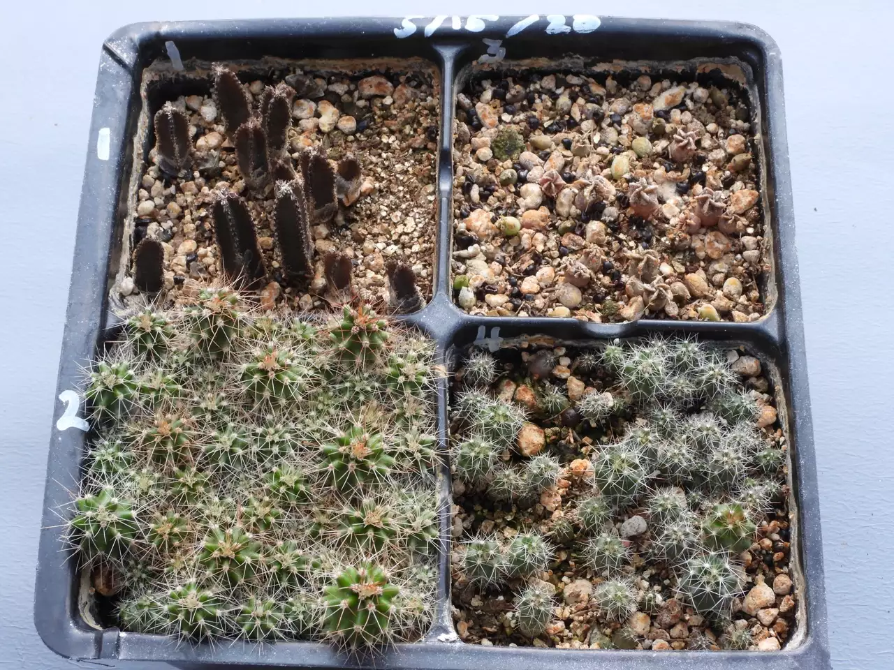 A few things to notice. The E. triglochidiatus plants are crowding out of their cell. Note how much they've grown in the two weeks since the last picture. (This is called "exponential growth." The whole world will become intimately knowledgable with this mathematical notion as the coronavirus rips through all of our human populations, killing probably millions, that will not wear masks and socially distance.) I know from experience that there are probably many more seedlings in this cell that I can't see and therefore can't count. More germination has happened but these late germinators have been crowded out of the light. When I take this cell apart for transplanting the seedlings, I'll find lots of sickly pale green small things that are hardly recognizable as cacti, never mind E. triglochidiatus. Technically, the runty misshapen things are called "etiolated" plants. In some cases, if given proper light and air, they can be restored to their phenotypical selves, that is, they'll eventually look like E. triglochidiatus plants. The Astrophytum capricorne cell has met some small disaster. There are many fewer plants that at peak germination. Probably some fungus attack happened. Look carefully at the southwest corner of this cell. There is a newly germinated seedling present - the green thing. Germinations four months after the bulk of seeds have germinated is not unusual. Neither is more germination after one year. To repeat something from the Set 1 description: I have never grown Echinocereus triglochidiatus and Escobaria missouriensis next to each other before this. I never noticed how much the two species look alike at this very young stage in their lives. The two species do look different at an earlier stage, as you saw in Set 1. The two are starting to again look different to me. In a few months, the two will look radically different. The Echinocereus triglochidiatus may eventually (years) become 3 feet tall, or more. The Escobaria missouriensis will get about an inch or two tall in that same time interval. The three species of cacti in cells 2, 3, and 4 will eventually get a green epidermis. The Peniocereus greggii will always look brown. In nature, this species stays in the shade of a bush, so it's not set to go green in good light. It stays out of good light if possible.