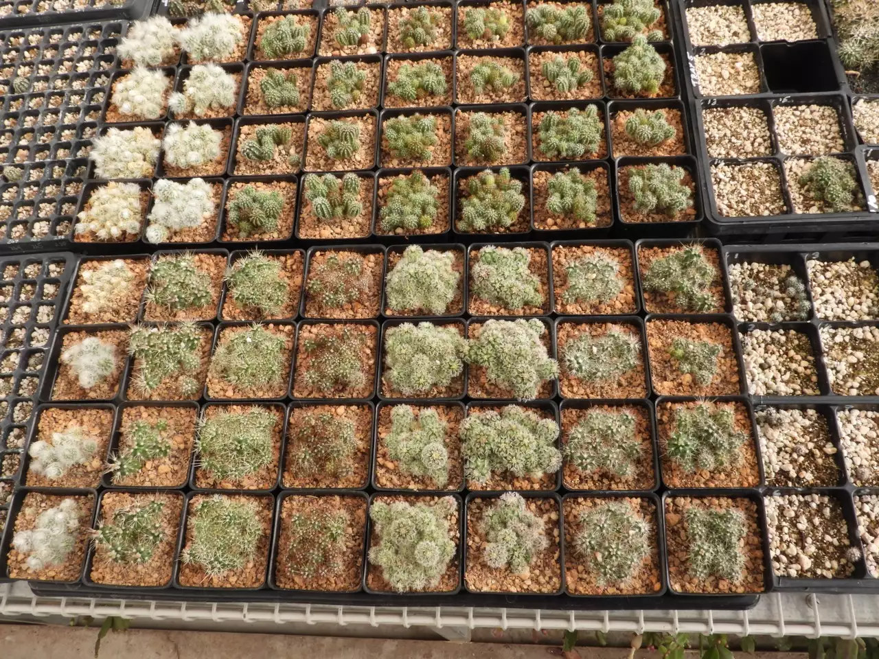 So, I did that, with the results shown above and following. I'm sorry that I didn't take pictures of all this right after the de-clumping/dividing and transplanting. I'll have to tell you what happened. I divided the overcrowded cactus seedling clumps into roughy fourths, and transplanted them into 2.5" pots. All of the clumps of cactus seedlings that you see, above, have about doubled in size after their transplanting into these 2.5" pots. The real news is that I can't find any death among the seedlings. That is, I usually expect huge losses on transplanting seedlings at the stage these were just before transplanting. I always thought that the smart thing (and logical thing??) was to separate all the bigger seedlings and give them their own cell in which to grow further. Then they died. Fifty years of this. It's a little late to learn from this (I'm 76 years old) but I'll never do again what I've done for 50 years. I will always do the first transplants in clumps. In fact, I will do another big planting of seeds in a month or so to test all these ideas. I'll keep the number of seeds to about 2 X 32 cells, or, 6,400 seeds. I actually don't want the work of a huge number of seeds. Yeah, I know, you think 6,400 seeds is huge.