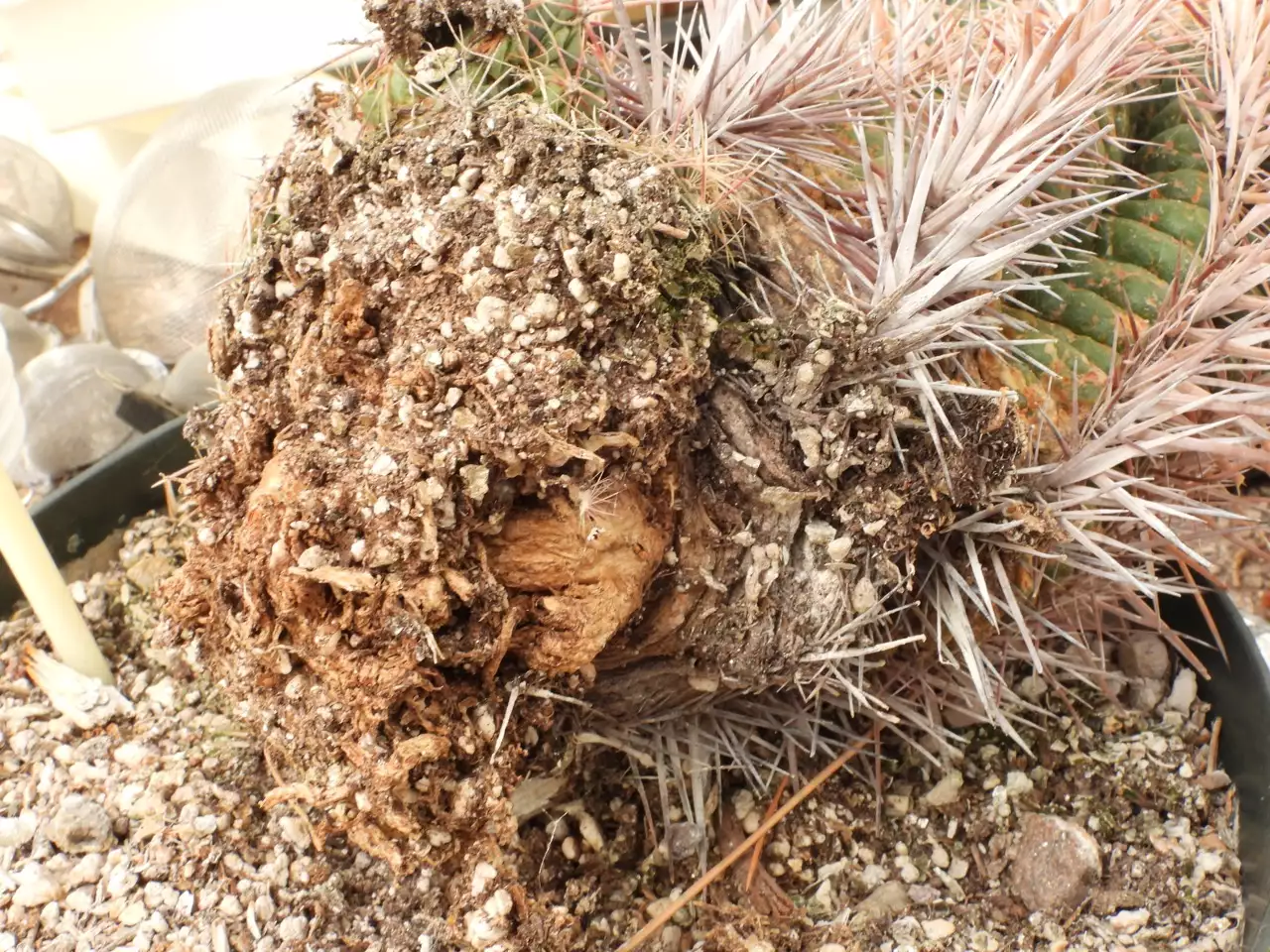 If you have a plant that should be growing and it's not, check the roots. You'll often find something like this Thelocactus bicolor. There are no roots. A plant can't take in nutrients and water without roots. (Not quite true, but in the main, true.) You have to start cutting across the plant where the roots should be to evaluate the problem.