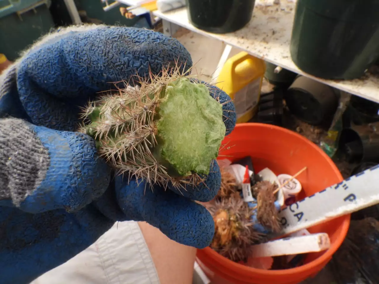 None of the cuttings had rot up into the stems that I cut off. I happened to hold this stem just right so that you can see the hardened super glue bandage. A sharp knife can do the cutting on smallish plants. The woody structure is not very big and may not even be noticeable.