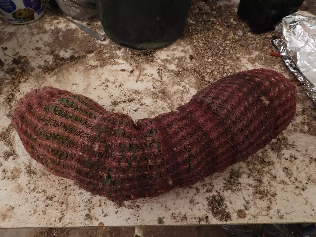 This is how this Echinocereus rubispinus came out of winter quarters - an unheated cloche between my greenhouse and garage. The roots rotted and the plant collapse on itself, making the bend. It couldn't maintain its turgidity without roots to take up water.