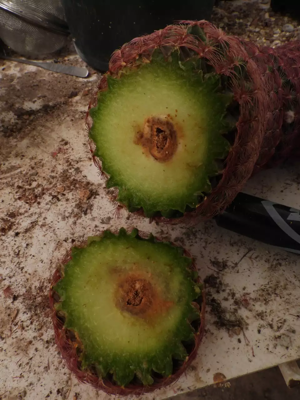 I cut more of the rotten root zone off (the lower piece), and I got the bad news. The fungus has made it up into the plant, traveling up the vascular bundle. (The reason the fungus travels up the vascular bundle may simply be that that's where the nutrients are concentrated. The fungus is a parasite eating the plant's food, and/or the plant) I was amazed that the plant's immune system has been checking the fungus somewhat. This plant is a goner, I think, but for the sake of the science, I decided to try the super glue treatment.