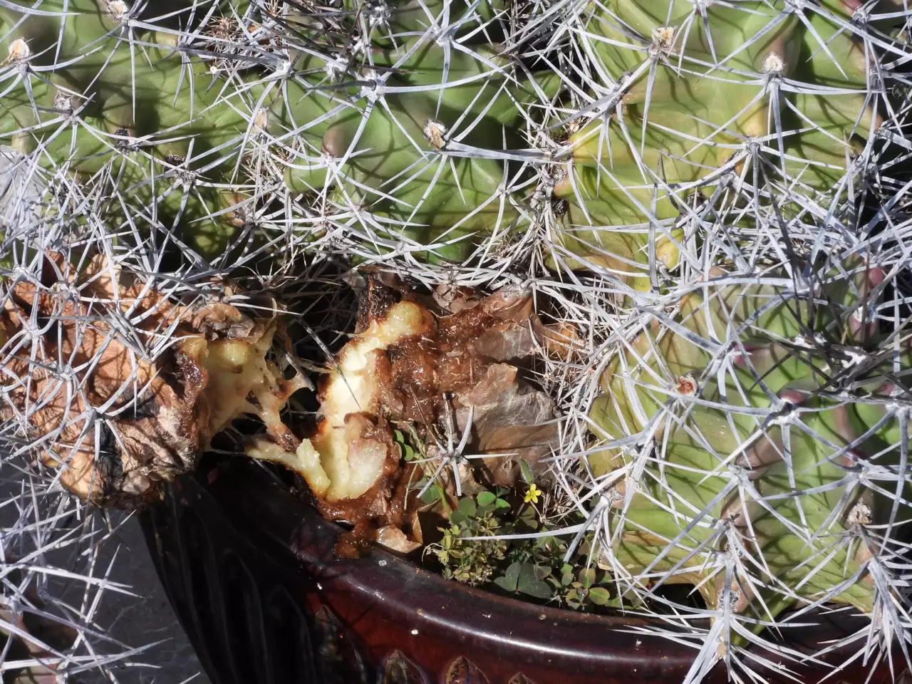 This is an Echinocereus triglochidiatus in a 5 gallon pot, growing outside for several years. At the end of the summer I noticed that there was a really rotten stem. The rot was of the very wet type. I removed as much of the rot as I could and sealed the wound with a lot of super glue. This is enough rot, I think, to eventually kill the plant. Spring 2020 will tell me if I did it any good.
