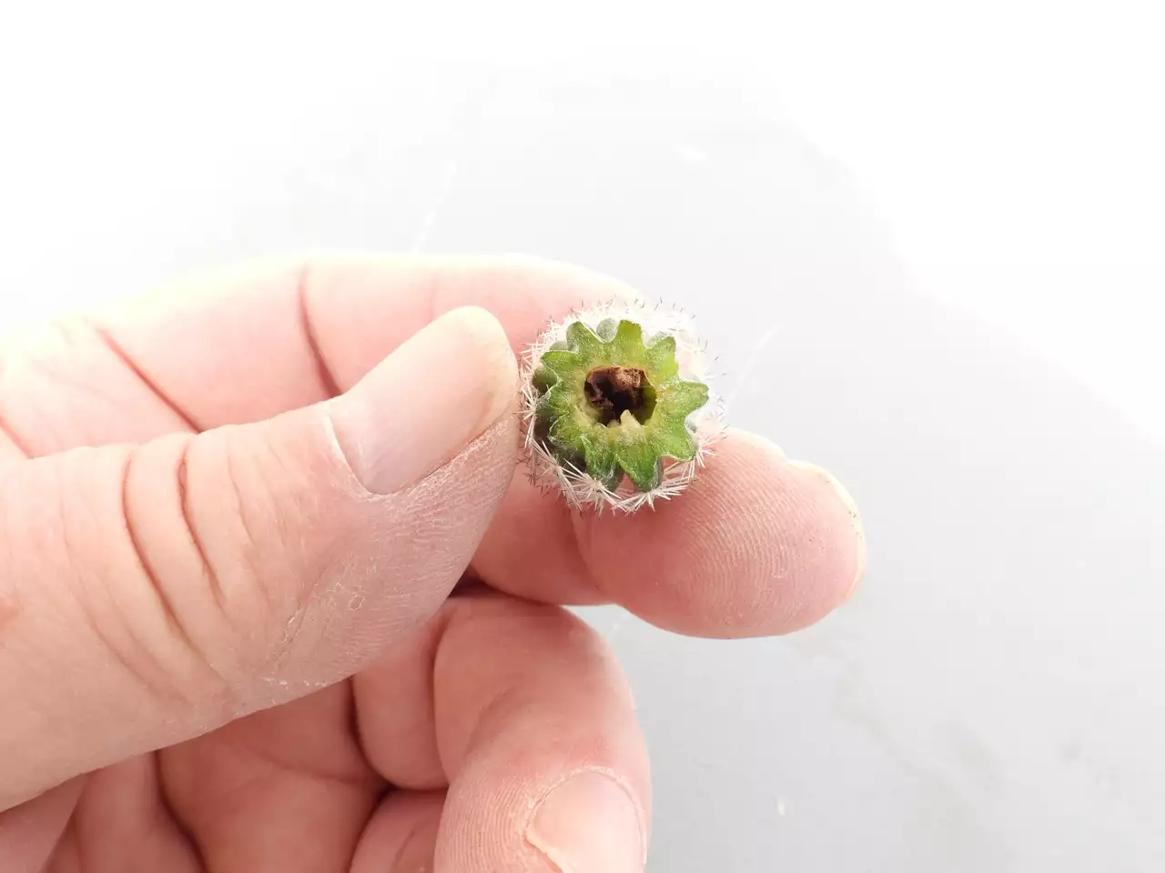 This is an Echinocereus seedling that rotted off at the roots, the rot traveling all the way up the vascular bundle.
